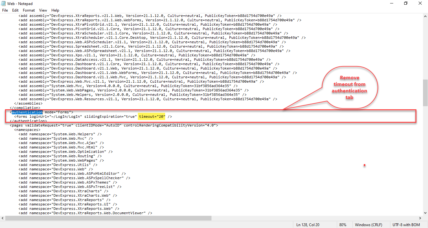 3.1. Remove the timeout part in the authentication and from the sessionState tags.