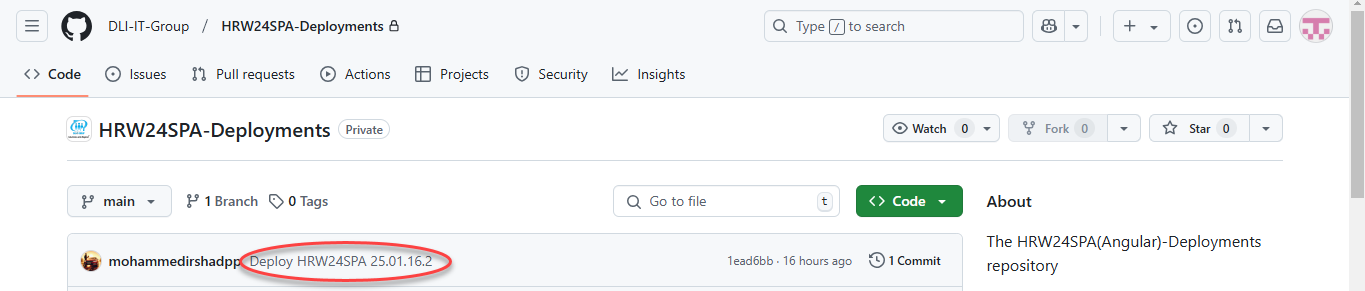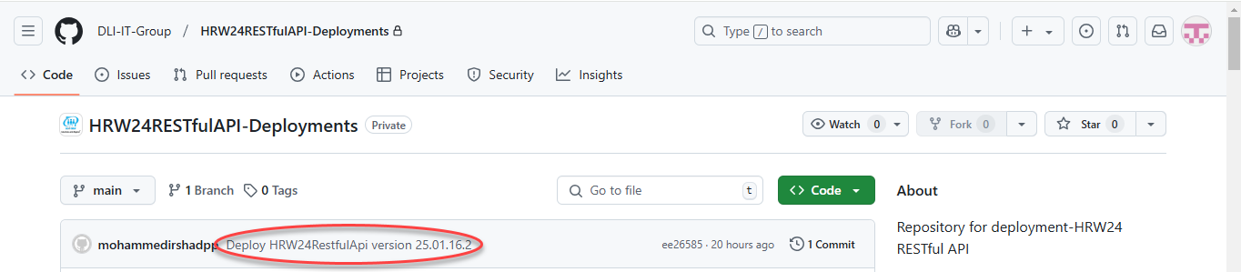 Before downloading, ensure you check the versions of both HRW24SPA-Deployments and HRW24RESTfulAPI-Deployments. The versions are displayed on the repository page at the top of the repository contents, next to the header.