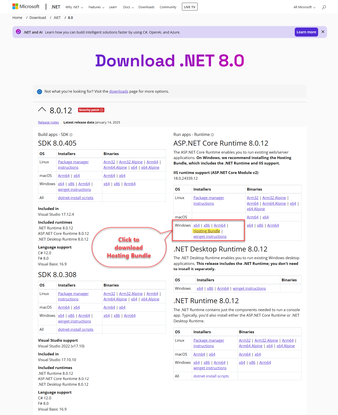💡 Before starting please ensure that you installed the Hosting Bundle in your system, otherwise download and install it from the following link: ASP.NET Core 8.0 Runtime (v8.0.12) - Windows Hosting Bundle Installer