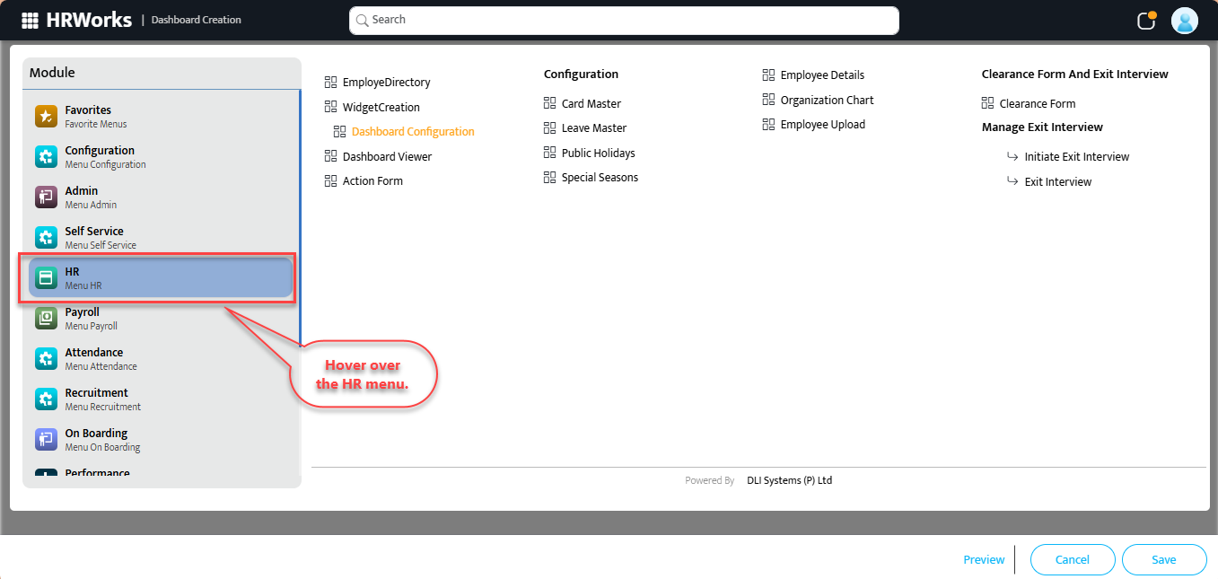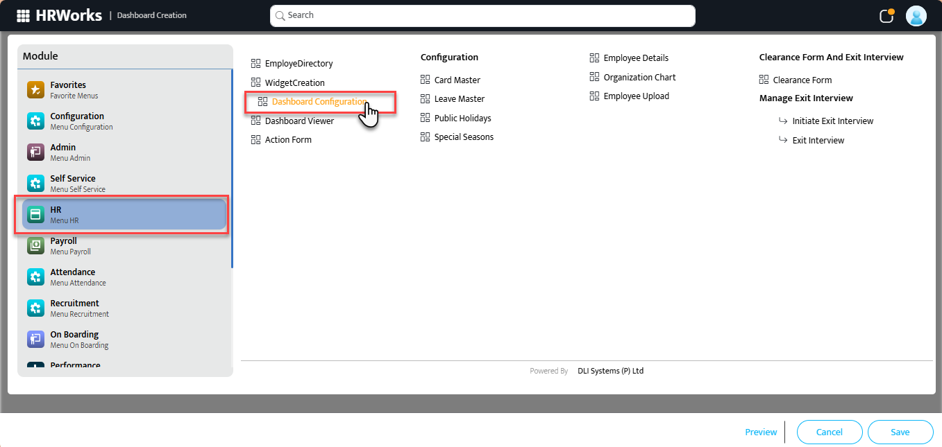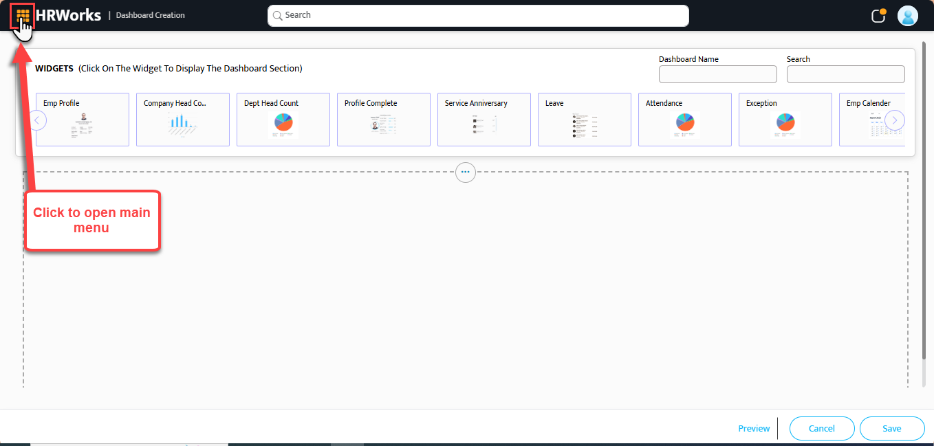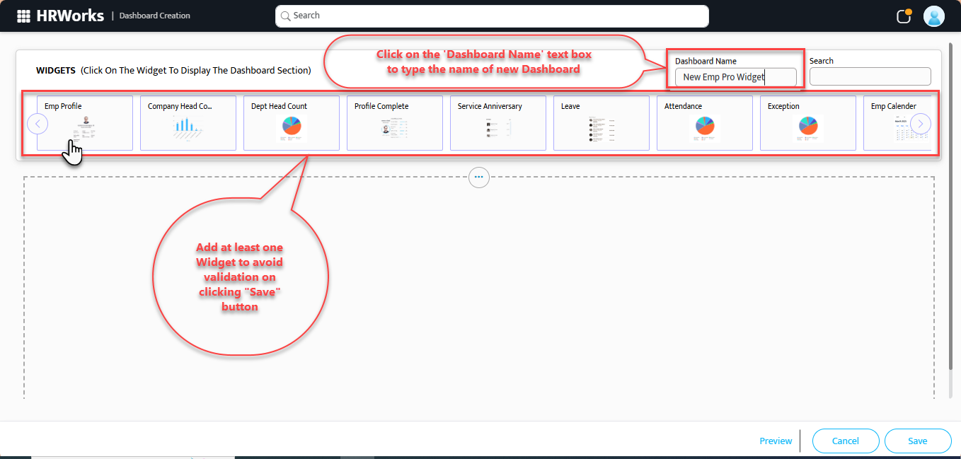 5. Type the name for your Dashboard in the Dashboard Name text field. And add any Widget by selecting the required type from the Widget Palette provided above.