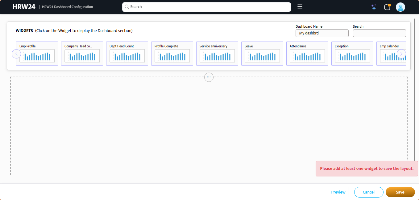 At least one widget should be added when creating a new dashboard; otherwise, the following validation will be shown.